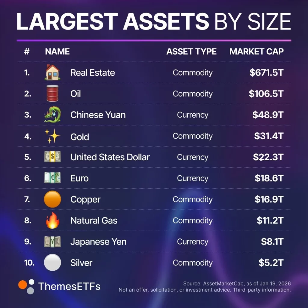 Цікаво, що золото, яке часто вважають головним захисним активом, займає лише четверте місце з капіталізацією 31,4 трильйона доларів. Це порівняно з розміром індексу Nasdaq, але в 20 разів менше за ринок нерухомості.