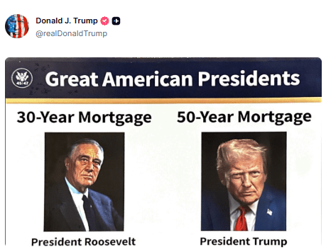 Директор Федерального агентства житлового фінансування (FHFA) Білл Пулте заявив у суботу, що його відомство «працює над» впровадженням іпотеки на 50 років після того, як Трамп опублікував у соцмережах зображення з підписом «50-year Mortgage» («іпотека на 50 років»). «Це повністю змінює правила гри», — написав Пулте.
