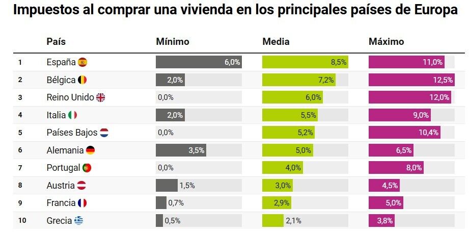 До п’ятірки країн із найвищим фіскальним тиском також входять Велика Британія (до 12%), Італія (5,5%), Нідерланди (5,2%) та Німеччина (5%). Для порівняння, у Швейцарії діє повне звільнення від податку на купівлю нерухомості — з 2005 року це стало одним зі способів залучення інвесторів.